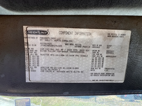 2008 FREIGHTLINER M2, CUMMINS ISC 260HP/2000 RPM DIESEL, 248,308 MILES, EATON FULLER MANUAL TRANSMISSION, 252"WB, 26,000 GVWR, NON CDL, AIR BRAKE, AIR RIDE SUSPENSION, AUTOMATIC LOCKS AND WINDOWS, SINGLE AXLE, LEATHER INTERIOR. THIS TRUCK IS SOLD AS IS.